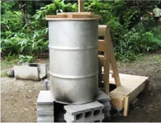 ・コンクリートブロックで作った焚口の上部に直径約60センチ、高さ約90センチのドラム缶風呂です